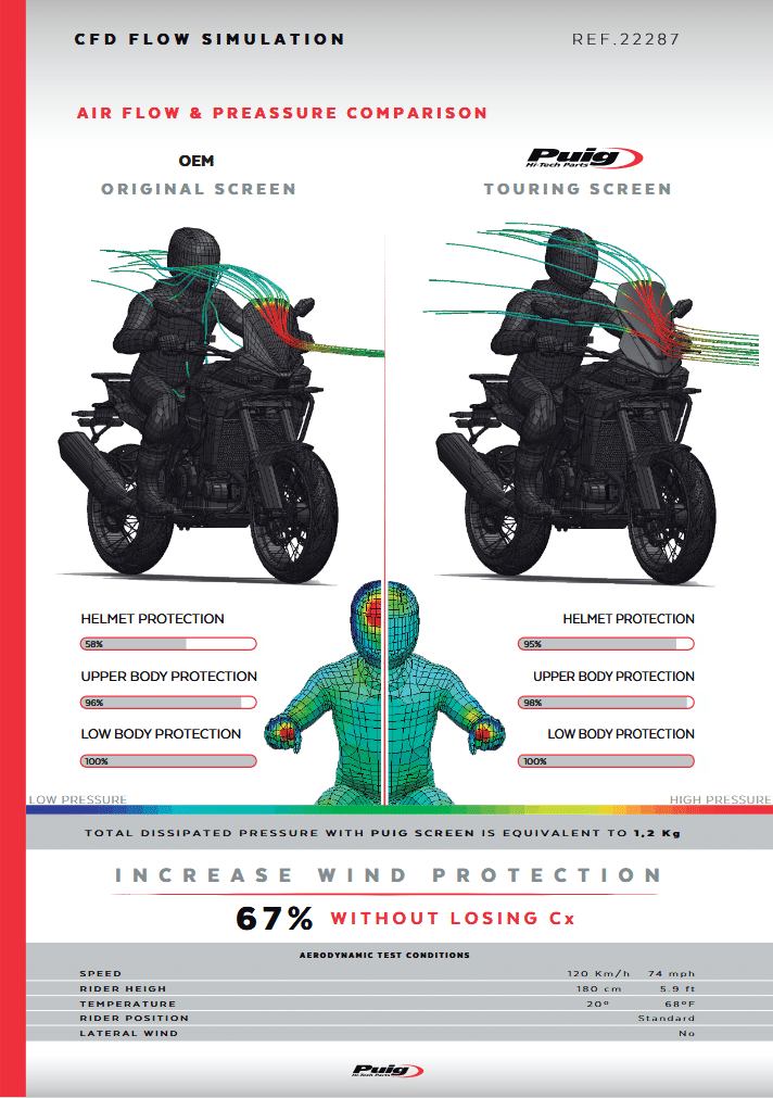 La partie supérieure centrale est entièrement plate, garantissant une excellente visibilité. Les parties inférieures latérales ont été spécialement étudiées pour dévier l’air frappant les mains, améliorant ainsi le confort et l’aérodynamisme global.
