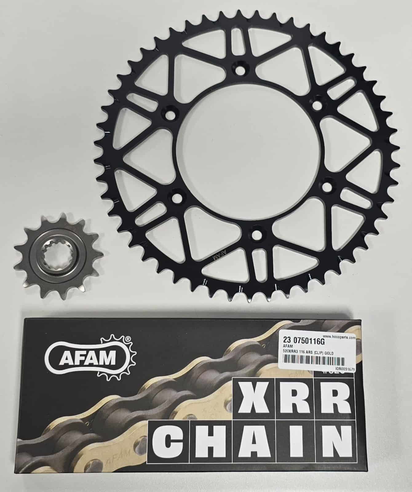 Chaîne AFAM 520XRR3 à joints toriques : Assure une lubrification constante et une usure réduite, prolongeant la durée de vie du kit. Livrée avec une attache rapide pour un montage simplifié.