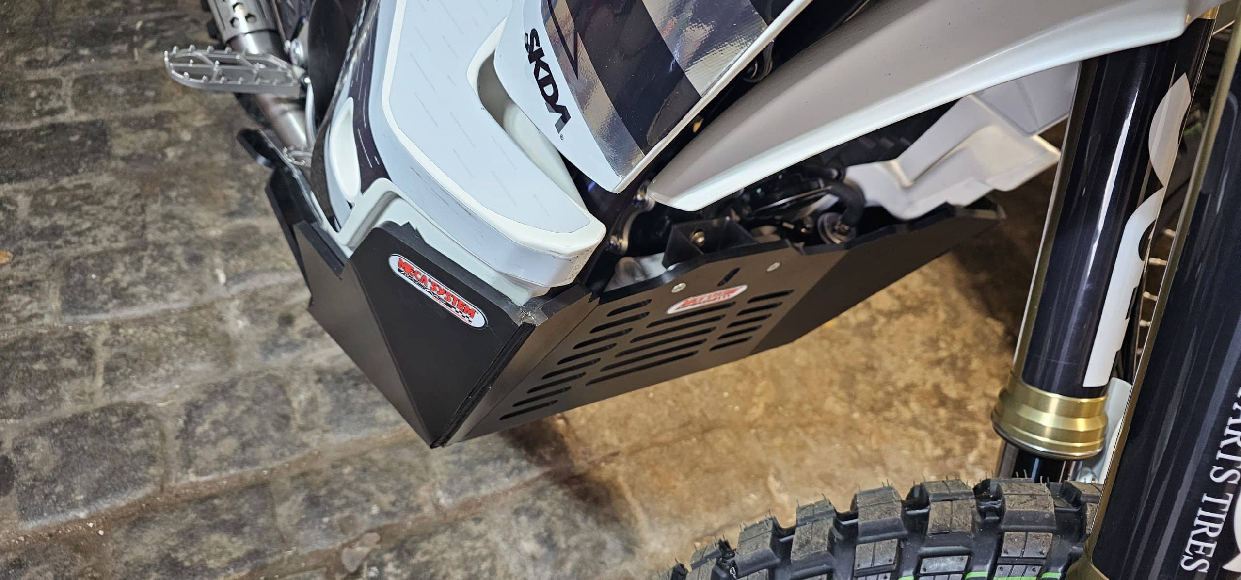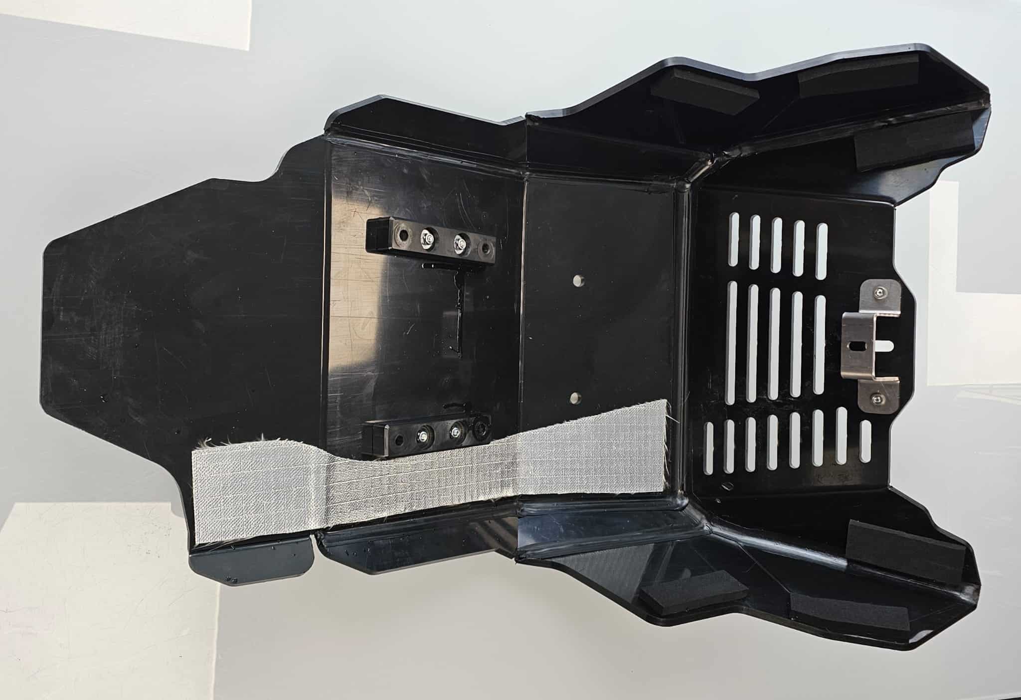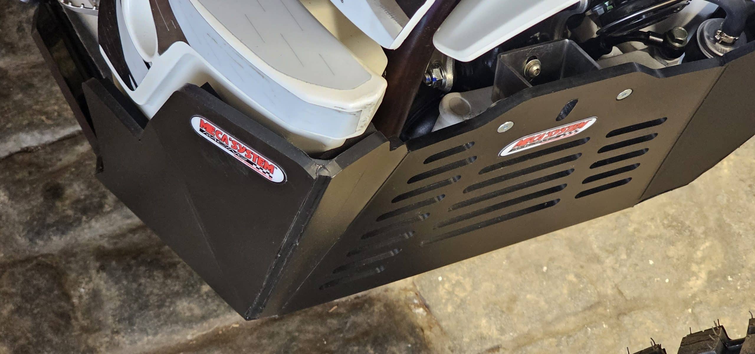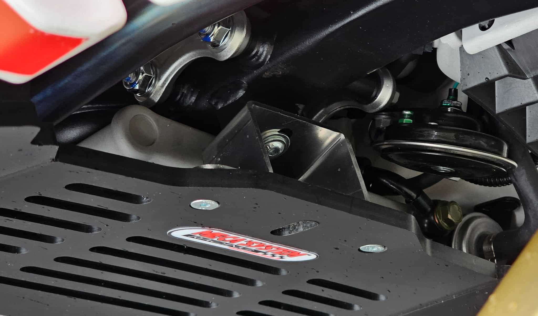 Remplace le sabot d’origine, protège également les biellettes et le tube d’échappement.