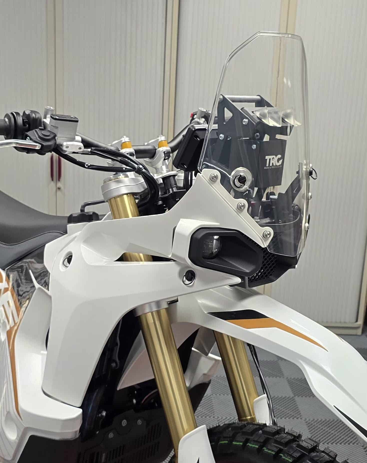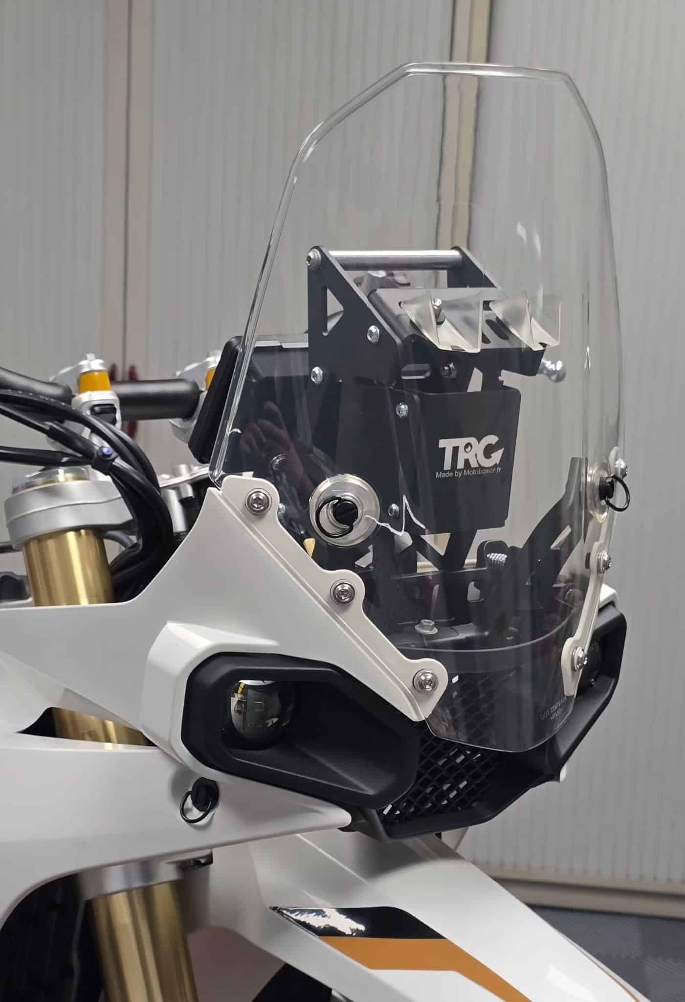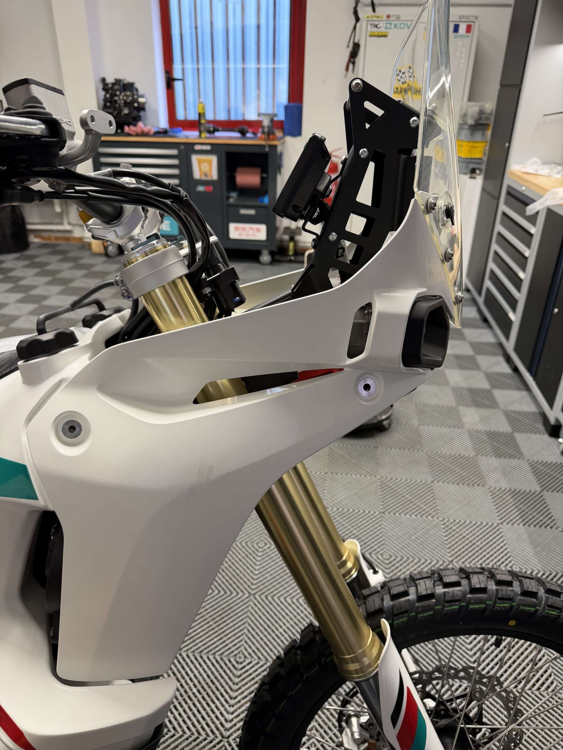 Kit comprenant une tour de rallye / tête de fourche allongée (+4 cm) et des carénages plus longs (2x) pour avoir plus de place pour la tablette ou le road book.